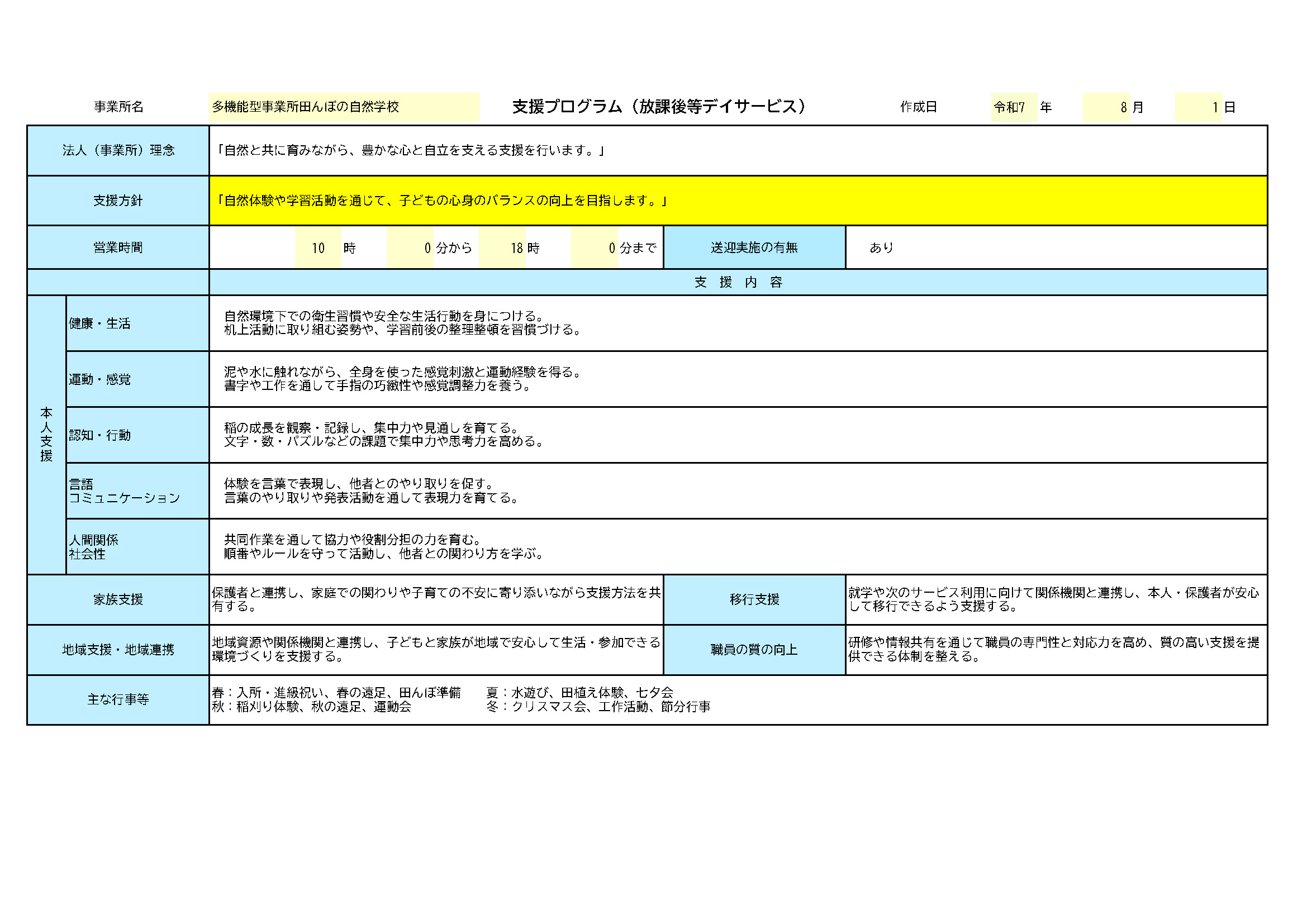 「多機能型事業所田んぼの自然学校」は、小学校に入学する前の児童「児童発達支援事業所」と小学校から高校生まで児童「放課後等デイサービス」の多機能型事業所で運営されています。コンセプトは週末・祭日を中心に田んぼ、泥んこ遊び自然体験です。農薬も化学肥料も一切使わない超自然農法です。オタマジャクシやトンボを追っかけで大自然の恵みを体験しませんか。もう1つコンセプトは「認知視覚実践プログラム」「ソーシャルスキルトレーニング」です。お子さまの、言葉遅い・五十音順がうまく言えない・九九が弱い・すぐにきれる等々、お母さん方の悲鳴がきこえます。そんなお悩みの解決は是非、田んぼ自然学校におまかせください。幼稚園・保育所・学校と連携し、発音・コミュニケーション力の実践プログラムを個別に計画書を作成し学習します。また、迎え帰りは、往復送迎付きです。安心しておあずけしてください。