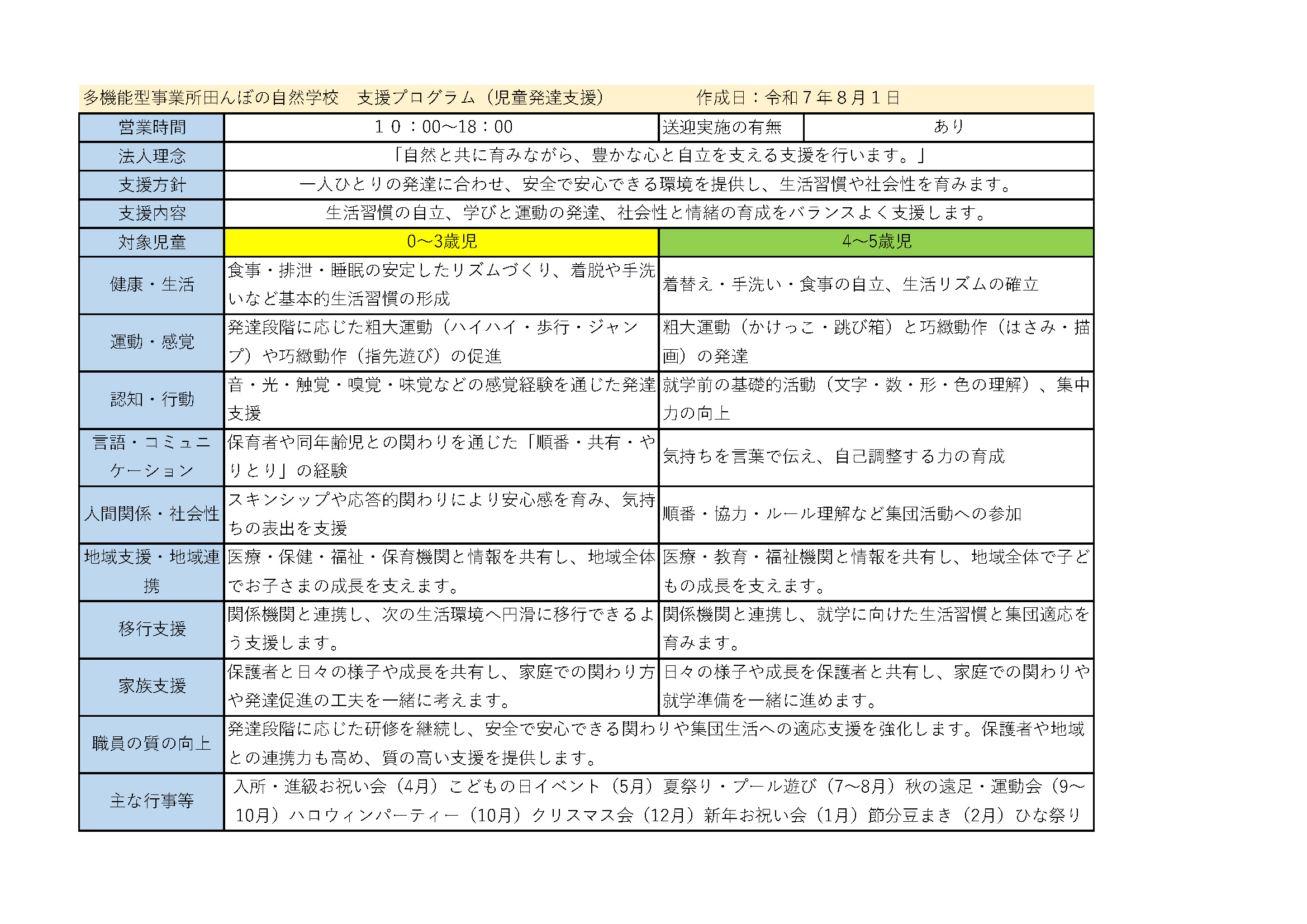 下記の表は一例になります。日常生活のリズムはご家庭により様々です。田んぼの学校ではお子様はもちろん、ご家族の負担を軽減するためのトータルケアを目標としております。